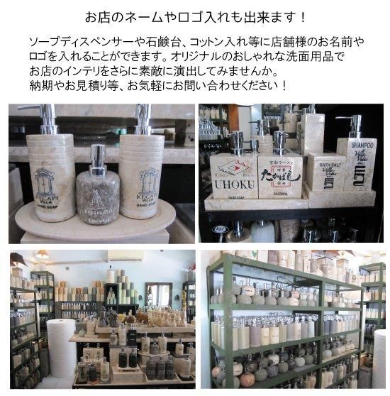 ソープディスペンサーや石鹸台、コットン入れなどに店舗様のお名前やロゴを入れることができます。