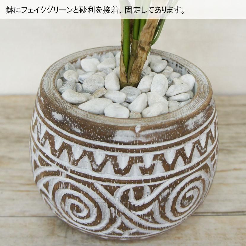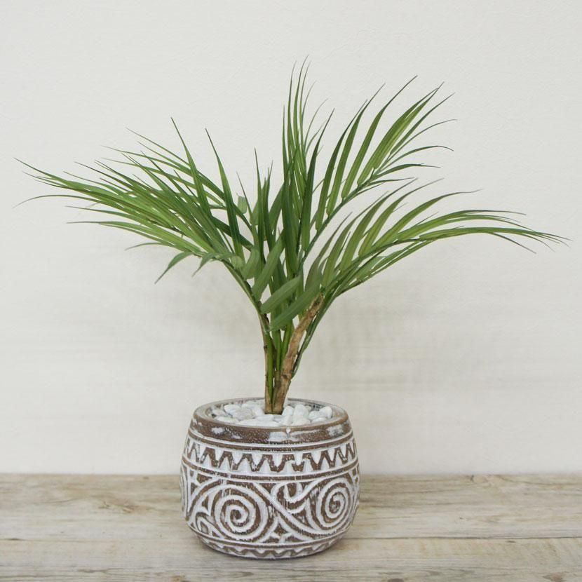 バリ島の木製彫刻の鉢に、人工のヤシをセットしたインテリアグリーンオブジェです。