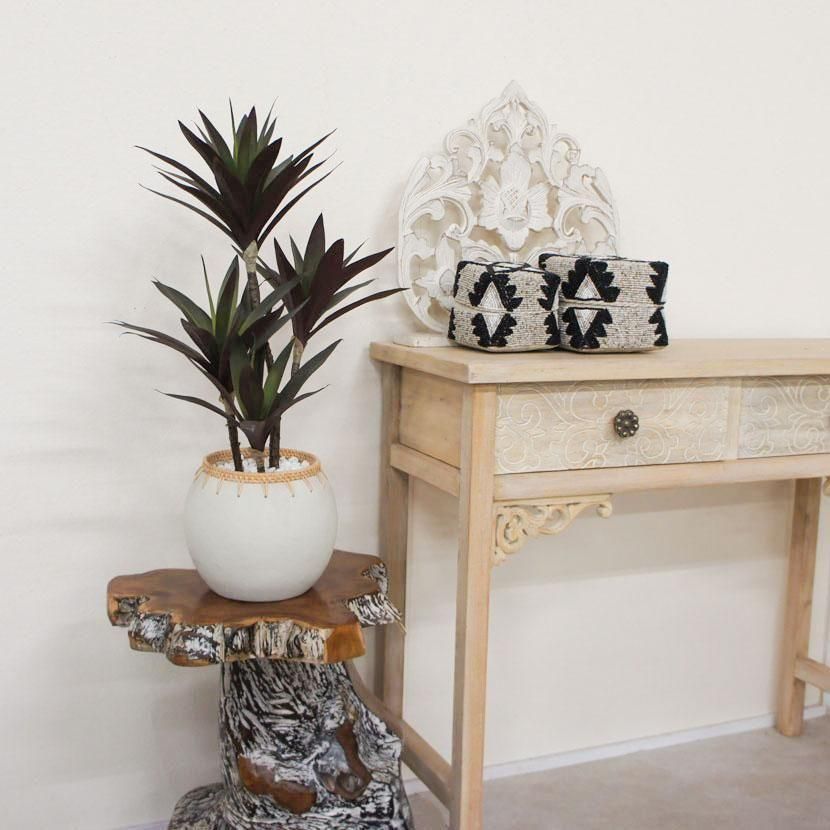 バリ島のテラコッタの鉢に、ユッカの人工観葉植物をセットしたインテリアグリーンオブジェです。