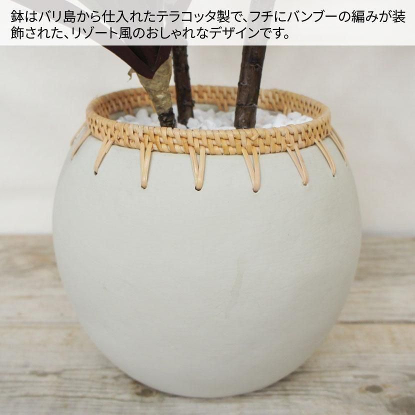鉢に使用しているのは、ハンドメイドのテラコッタの器で、フチにバンブーの編みを装飾した、シンプルなリゾート風のデザインです。